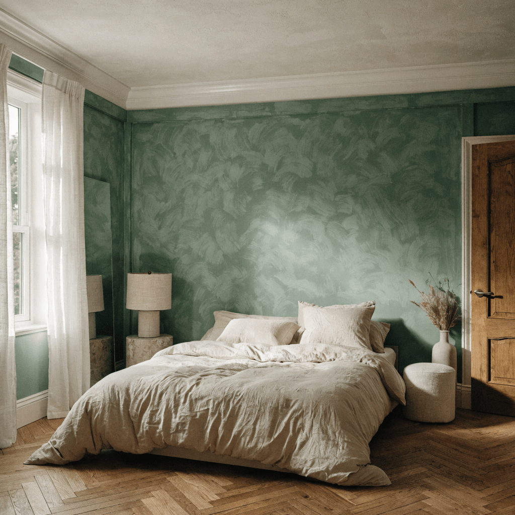 Light sage, mint, or eucalyptus tones work beautifully for airy bedrooms, while deeper greens can create cozy and intimate spaces.