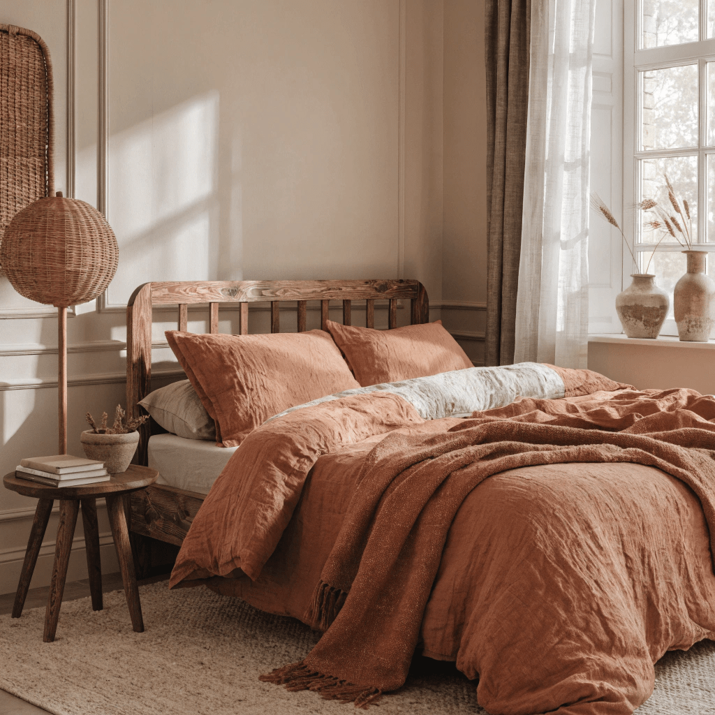 Warm sand tones create an elegant neutral base while terracotta adds depth.