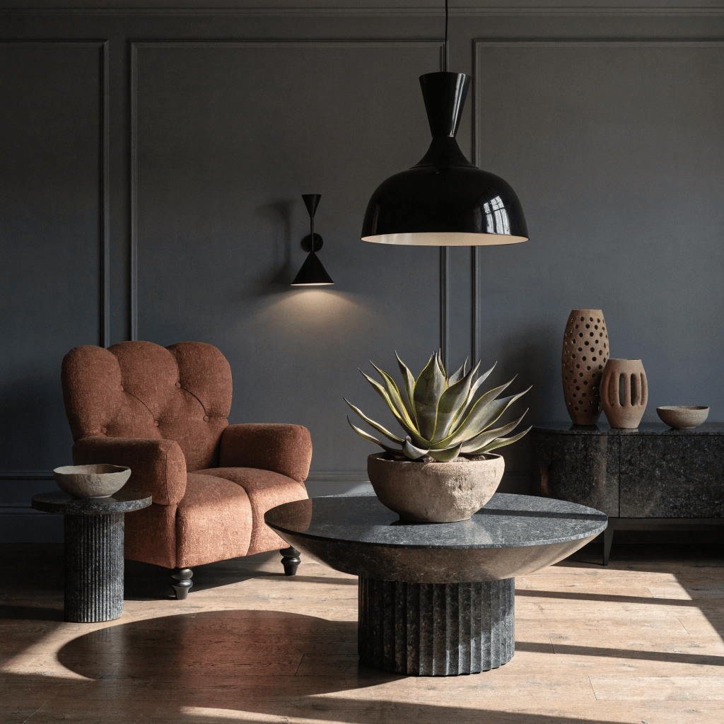 Charcoal adds depth and sophistication while terracotta prevents the space from feeling cold.