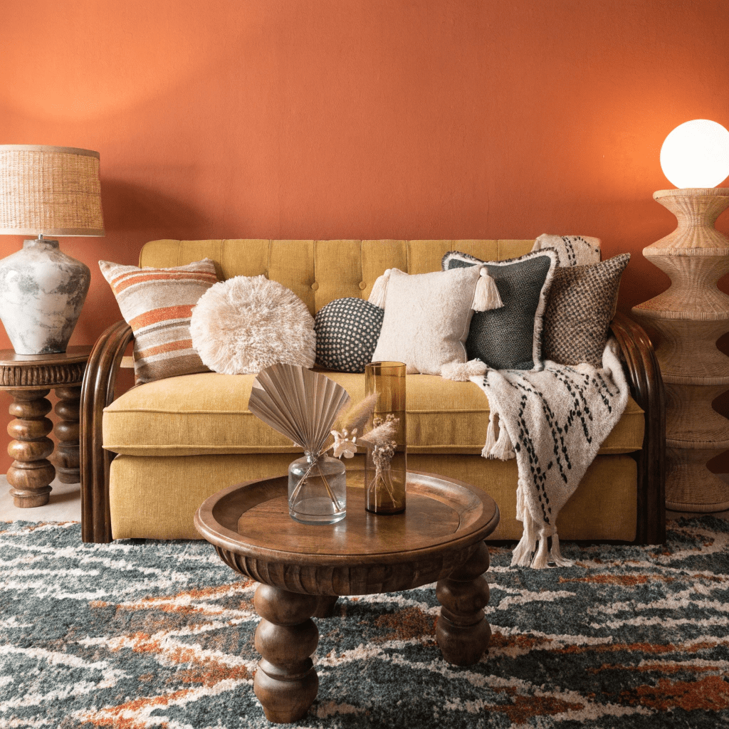 This combination is bold, energetic, and warm. Mustard yellow amplifies the richness of terracotta and creates a vibrant interior.