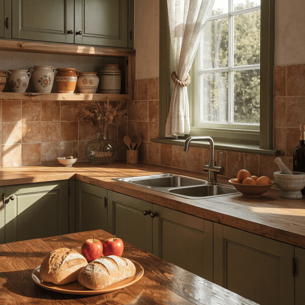 Olive green deepens the earthy character of terracotta and gives interiors a Mediterranean farmhouse feel.