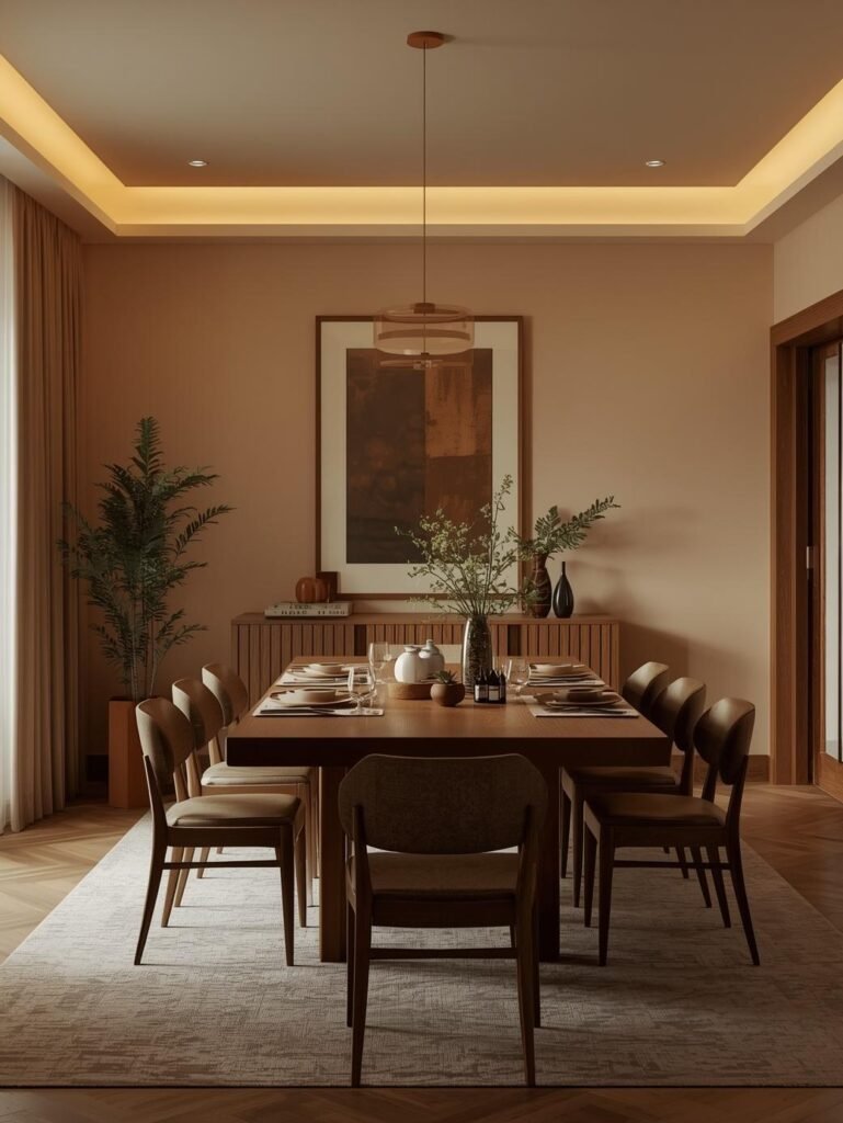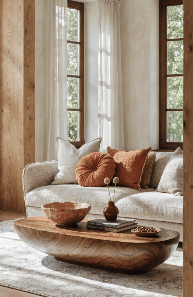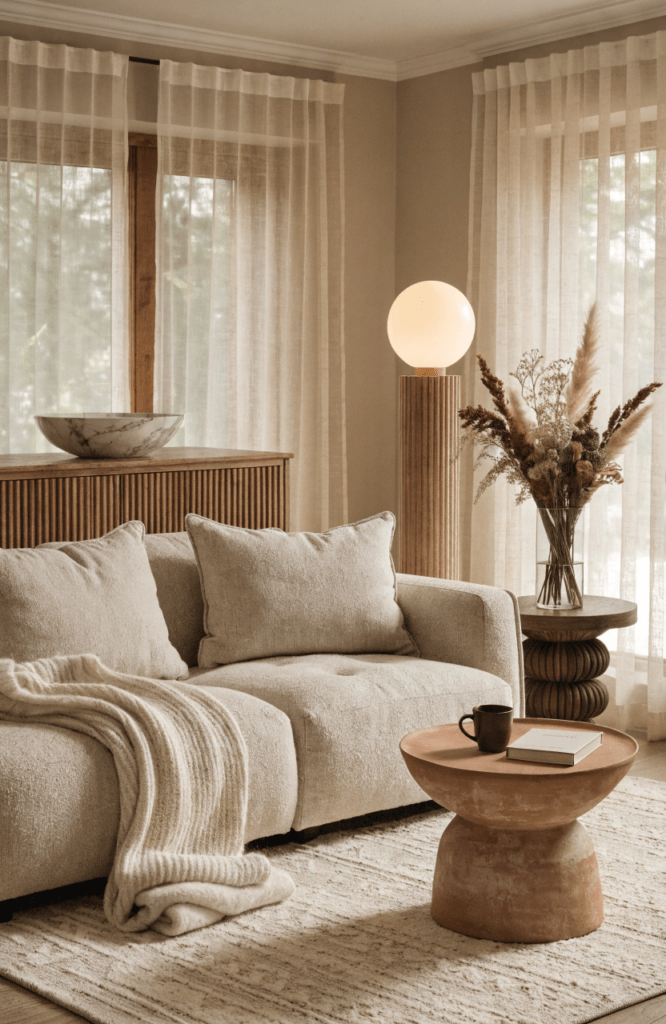 Use warm neutrals like beige or cream for walls and sofas, then layer textures such as wood, linen, and soft throws. Add accent colors like terracotta or olive through pillows and decor.