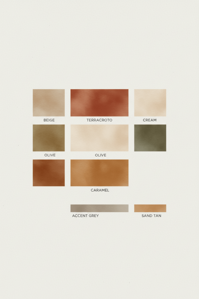 Warm colors include tones like beige, terracotta, soft brown, warm white, muted orange, and golden hues. These shades create a cozy atmosphere and are perfect for interiors that feel relaxed and lived-in rather than cold or overly modern.