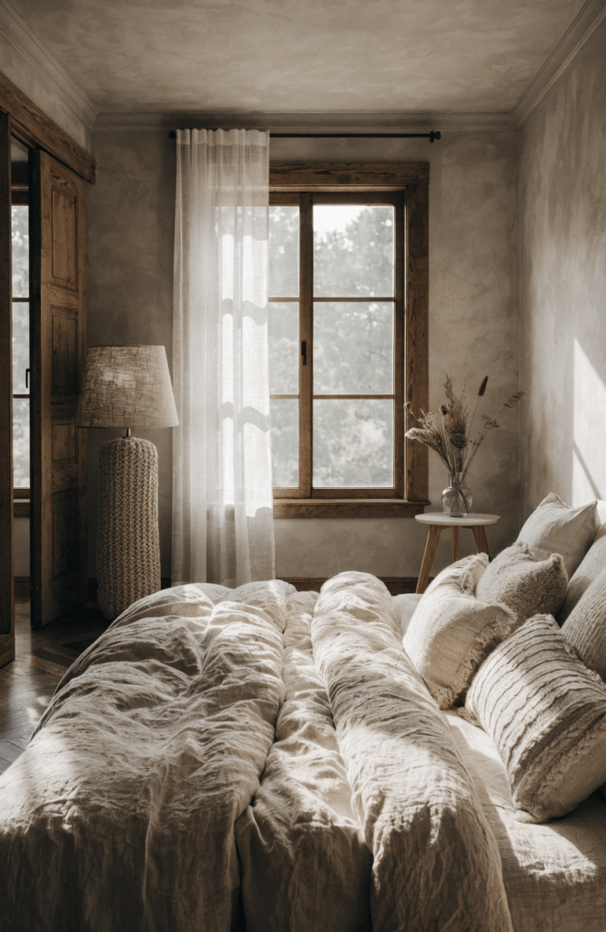 Keep the palette soft and relaxing. Use warm whites, light browns, and muted tones to create a peaceful atmosphere. Soft lighting is key to enhancing the warmth.
